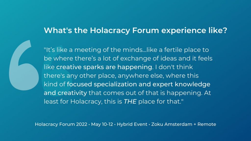 We’re a little over a month away from the hybrid Holacracy Forum 2022! Join your fellow practitioners from around the world as we gather in Amsterdam—or participate remotely—in this inspiring peer-to-peer learning lab: https://loom.ly/GJpHlJY