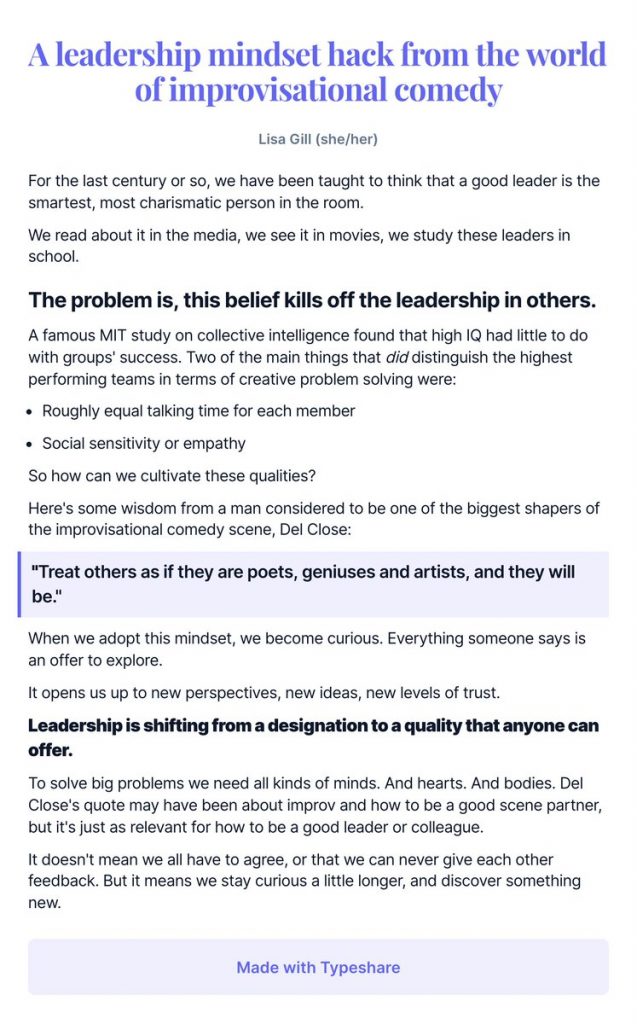 RT @disruptandlearn: In a previous life I was an actress. I learned many valuable lessons about leadership, especially from the world of improv. Here’s one of my favourites… #ship30for30