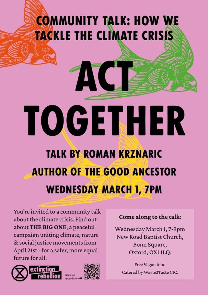 RT @romankrznaric: How can we be the Good Ancestors that future generations deserve? Join me and members of @XR_Oxford on March 1 for an inspirational evening of ideas, conversation (and good food) about how we can tackle the ecological crisis together @XRebellionUK @XrRebel https://www.xroxford.org/event/act-together-community-climate-talk-by-roman-krznaric/