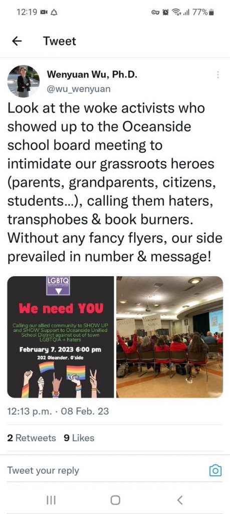 Wenyuan Woo is the definition of an astroturfed fascist, not at all “grassroots”. Nothing but ignorance and hatred propelling the anti-woke. https://twitter.com/wu_wenyuan/status/1623414852558655488