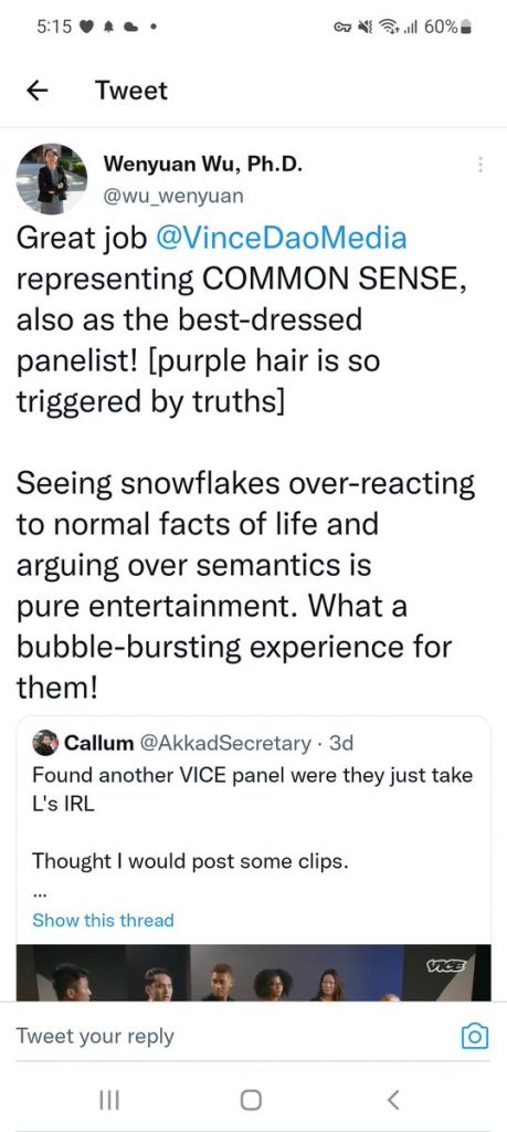 Absolutely unhinged bigoted denialist response to this video clip. Wenyuan and Vince Dao are just typical reactionaries, unconcerned with any kind of ongoing systemic injustice, because they are benefiting from it, and want to erase the critical voices. https://twitter.com/wu_wenyuan/status/1624212147076059143