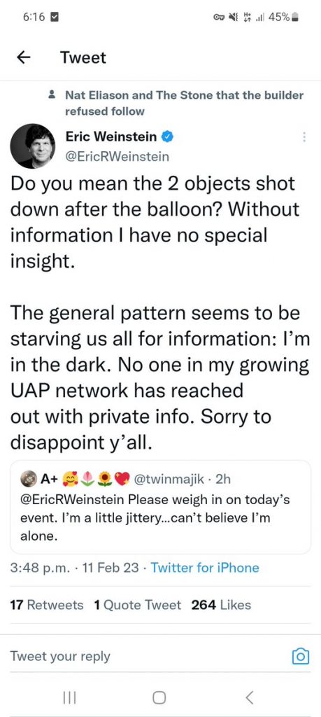 Really intrigued by his “growing UAP network” of very serious people. In all seriousness, the UFO tickles the would-be intellectual, with so many ‘official’ bread crumb trails, but they lead, invariably, nowhere, while providing endless stimulation for Eric’s smooth brain.