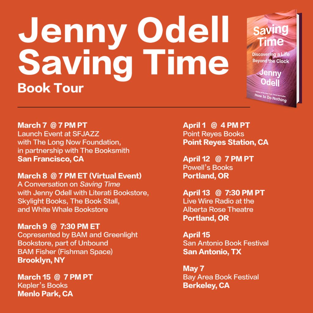 Join us on March 7 for the opening night of Jenny Odell’s SAVING TIME book tour at @SFJAZZ — tickets available now: https://www.eventbrite.com/e/saving-time-discovering-a-life-beyond-the-clock-tickets-528571721247 https://twitter.com/the_jennitaur/status/1628836096351301632