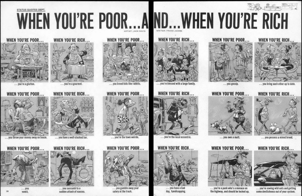 RT @PulpLibrarian: When You’re Poor And When You’re Rich. 1977 Mad Magazine spread by Jack Davis. #richkids #skint