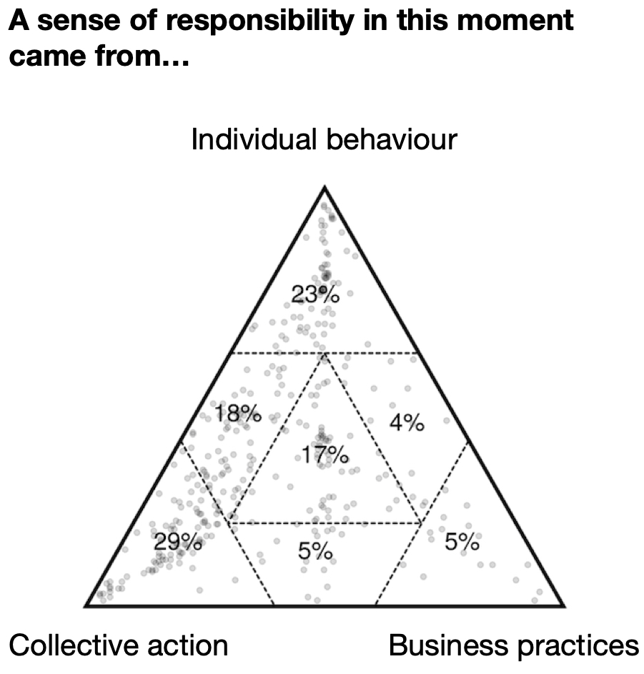 As we can see, people whose stories show a belief in the potential of business tend to emphasise more personal responsibility, less collective action and (unsurprising), more business practices.