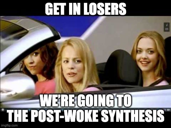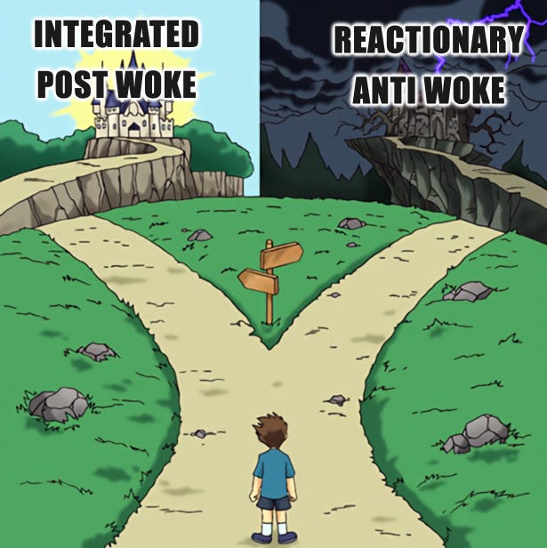 We’re at a fork in the road, two roads marked “anti-woke” and “post-woke”. I’m hoping we can avoid the reactionary trap and find the integrated post-woke synthesis.